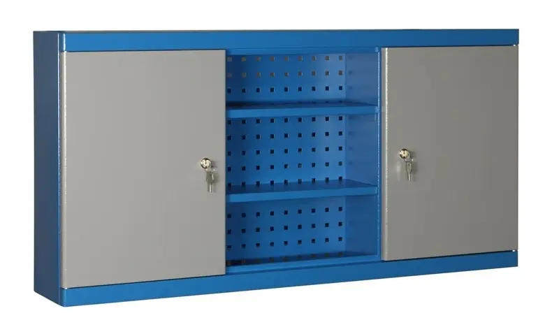 Kovové police můžete přestavovat po 25 mm, nosnost na jednu polici je 40 kg. Povrchová úprava práškovou barvou – korpus RAL 7035 (světle šedá), dveře RAL 5015 (modrá).