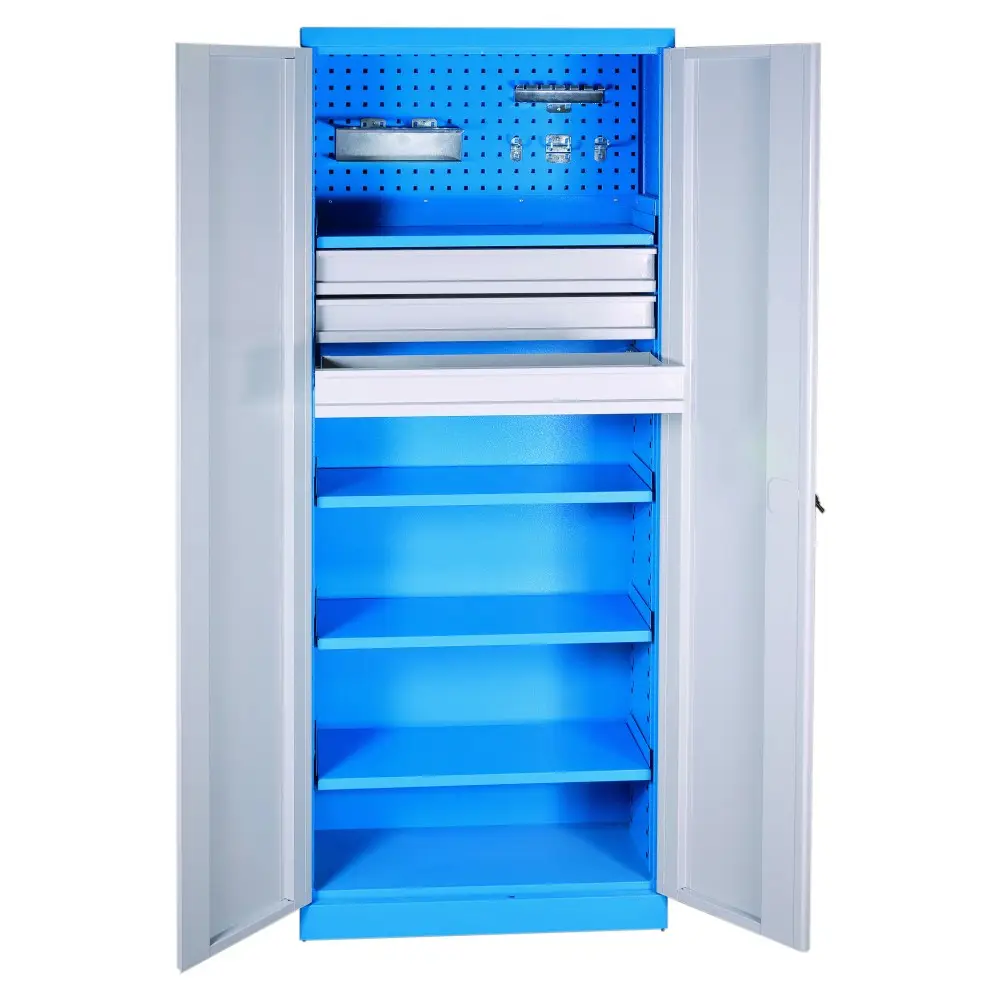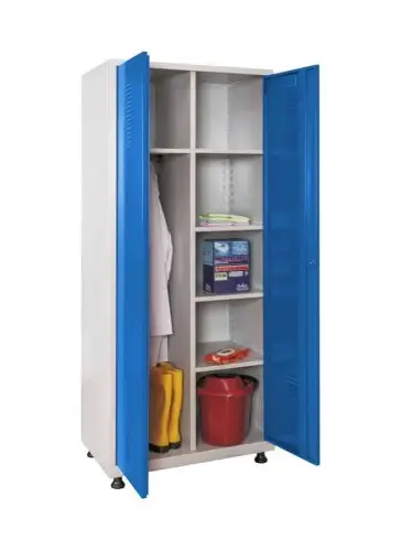Kovové police můžete přestavovat po 25 mm, nosnost na jednu polici je 40 kg. Povrchová úprava práškovou barvou – korpus RAL 7035 (světle šedá), dveře RAL 5015 (modrá).